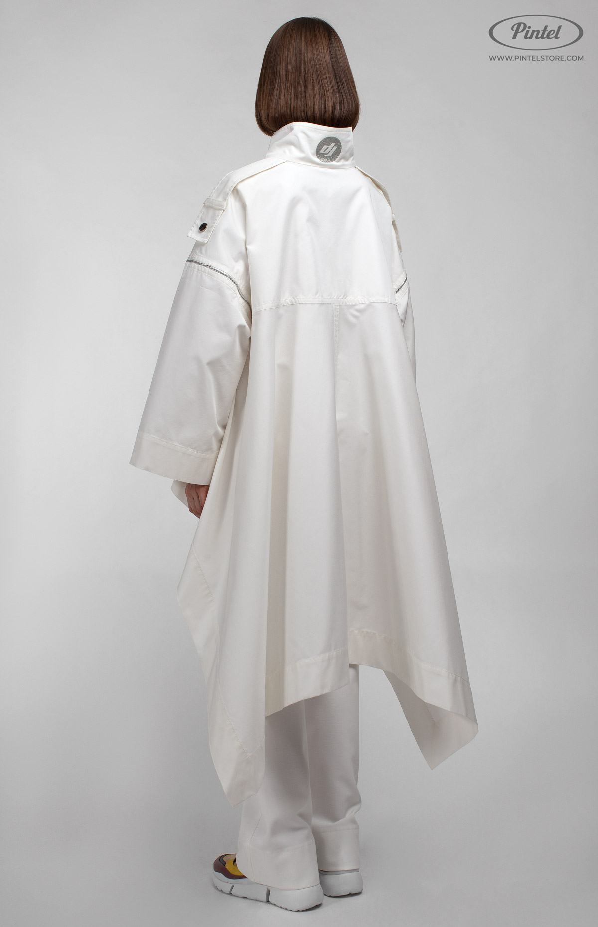 Asymmetric boxy genuine cotton cape with removable long sleeves and decorated with thermoapplications. Band collar. Front pin-buttons closure. Patch pockets. On the photo: model is wearing a size S and is 174 cm.