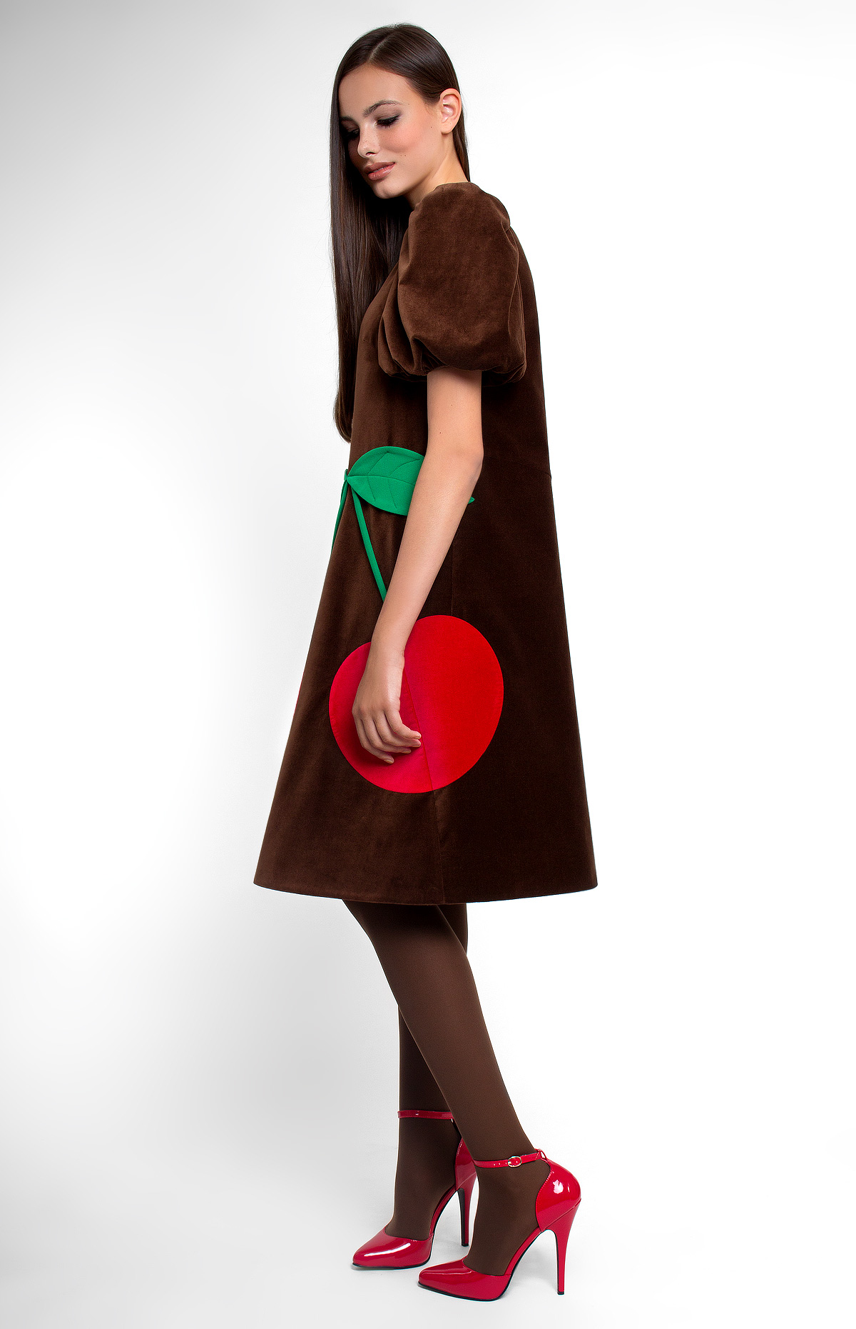A-shape cotton velvet dress. Boat neck. Balloon sleeves. Velvet cherries and three-dimensional true-wool leaves as decoration. Hidden back zip closure. Without pockets. On the photo: model is wearing a size S and is 176 cm.