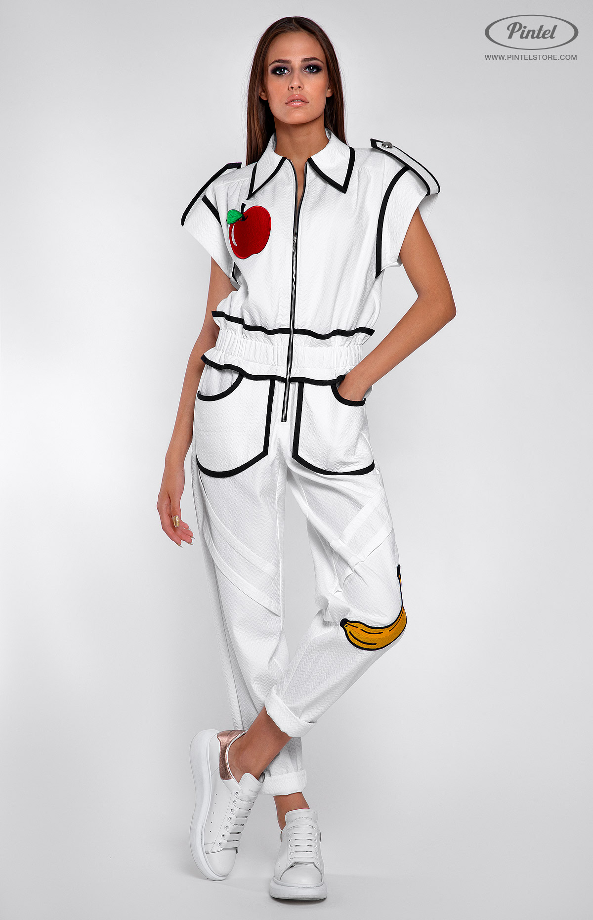 Short sleeve with contrast edging jumpsuit with drawstring waist and shortened banana pants. Turndown collar. Front zip closure. Decorated with bright colored designer patches. Patch pockets. On the photo: model a size S and is 181 cm.